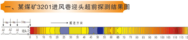 1、某煤礦3201進(jìn)風(fēng)巷迎頭超前探測控制距離68米,圖中顏色由藍(lán)到紅代表視電阻率由低到高,視電阻率越低表示介質(zhì)導(dǎo)電性越好;