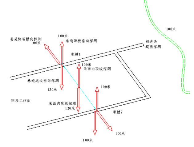 有效控制高度100m。主要探巷道頂板上方100m以內(nèi)主要含水層或其它標(biāo)志層的位置及賦水(或電性)差異特性。